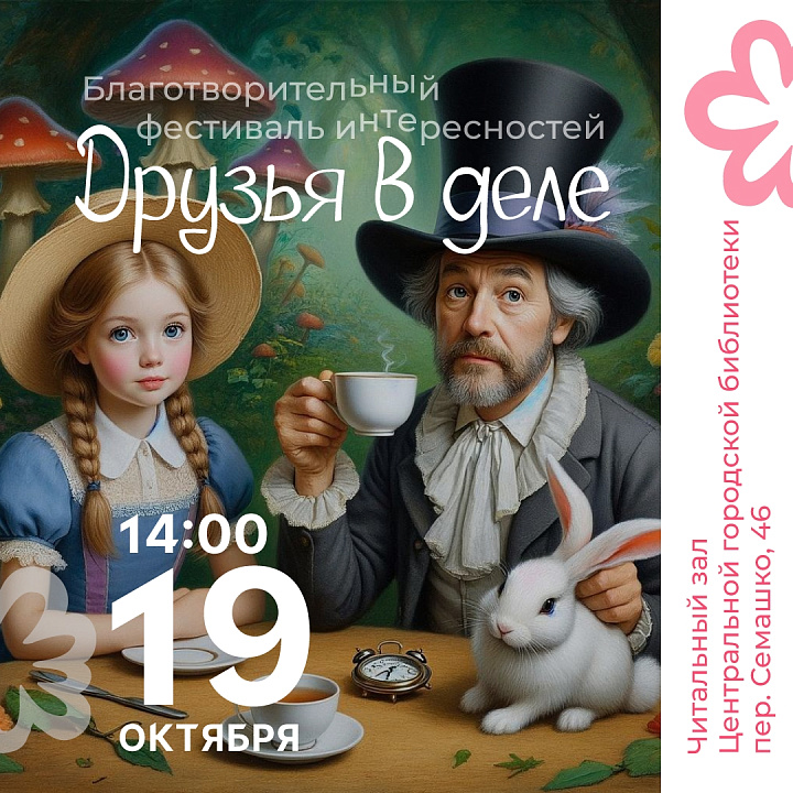 Фонд «Доброе дело» приглашает на 2-й благотворительный фестиваль интересностей «Друзья в деле» — для детей и всех, кто ими был. Тема этой встречи — сказка «Алиса в Стране чудес».Когда: 19 октября, 14:00 (сбор гостей с 13:30).