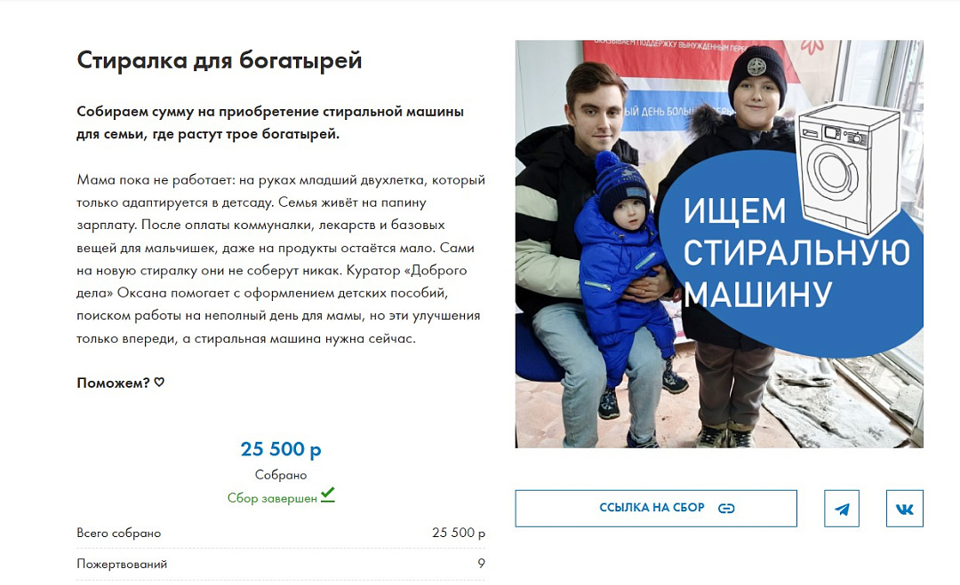 Буквально в считанные дни на стиралку и её доставку в семью вы собрали сумму в 25 500 руб.!Стиральная машина уже дома и работает! Мама так и написала: «Новая машинка стала настоящим спасением для нашей семьи!» Получилось приобрести помощницу вместимостью не 6 кг, как просила мама Катя, а 8! Слава скидкам ноября, знаете ли ))